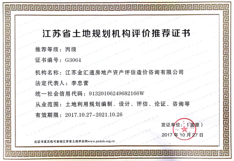 江苏省土地规划机构评价推荐证书