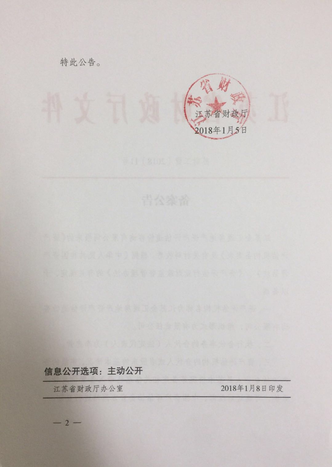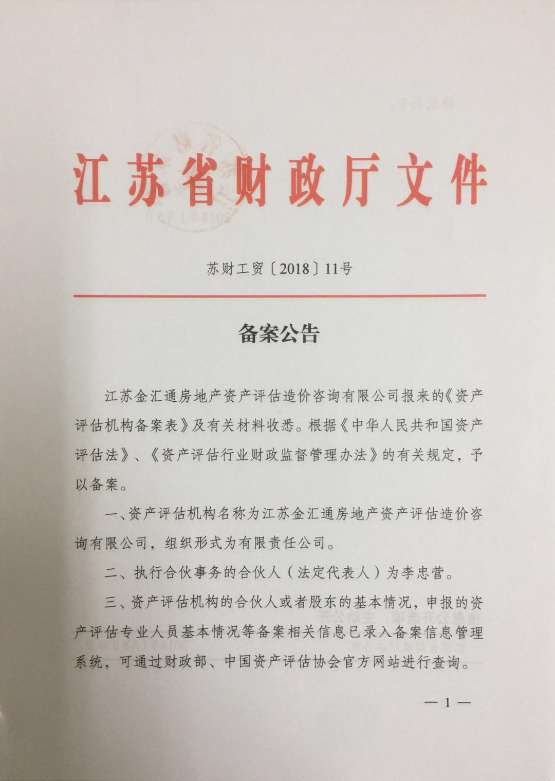 江苏省金汇通房地产资产评估造价咨询有限公司报来的《资产评估机构备案表》及有关材料收悉。根据《中华人民共和国资产评估法》、《资产评估行业财政监督管理办法》的有关规定,予以备案。