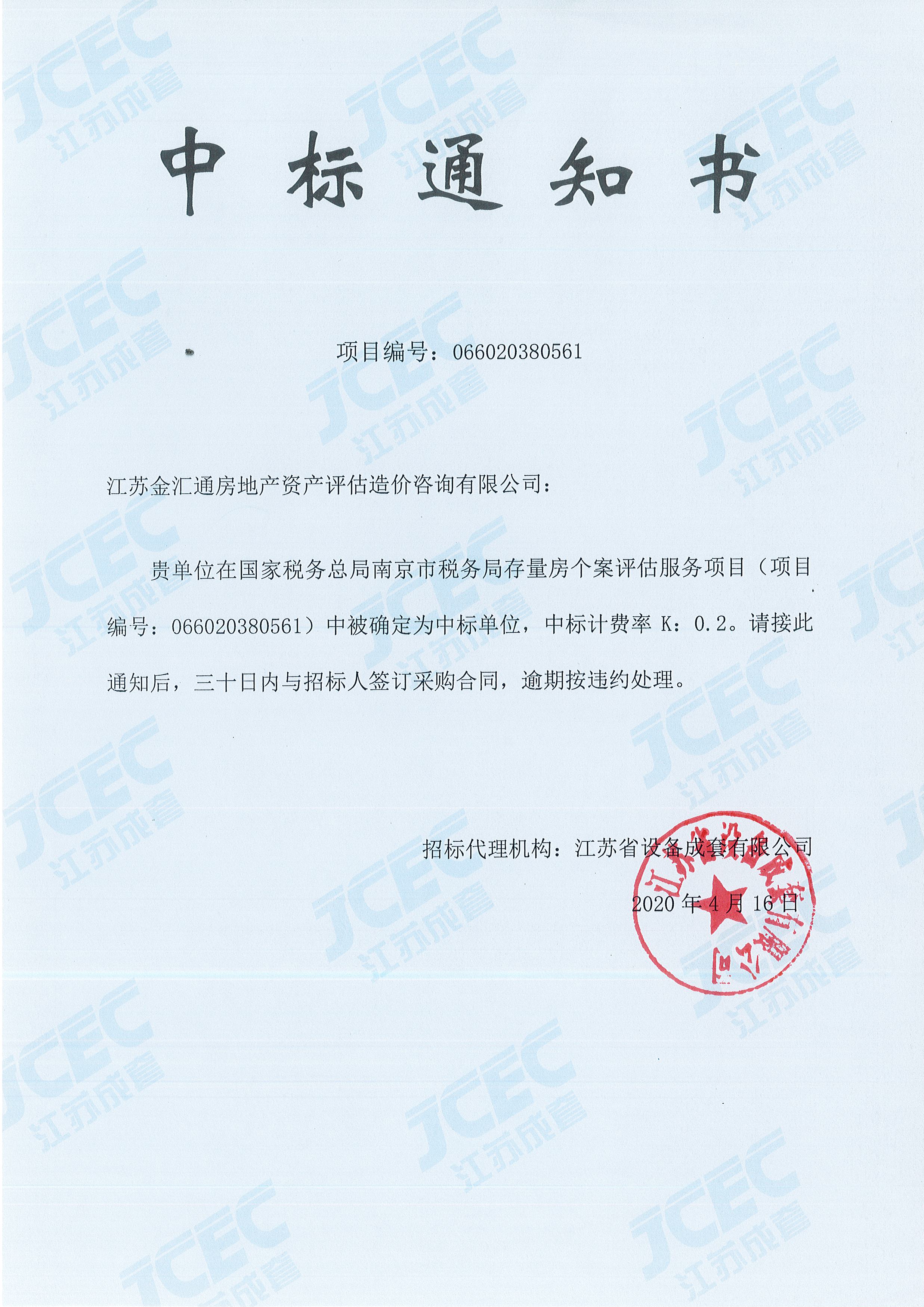 热烈祝贺我公司在国家税务总局南京市税务局存量房个案评估服务项目中被确定为中标单位。