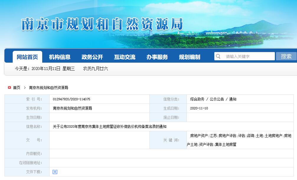 为规范全市集体土地房屋征收补偿行为,加强对估价机构的管理,依据《南京市集体土地房屋征收补偿评估管理办法》(宁规划资源规〔2020〕10号),我局开展了估价机构备案工作。经审核,现公布“2020年度南京市集体土地房屋征收补偿估价机构备案名录”,供征收当事人选择,详见附件。