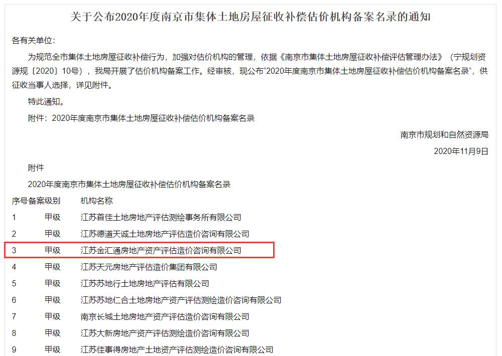 我公司成功入选2020年度南京市集体土地房屋征收补偿估价机构备案名录